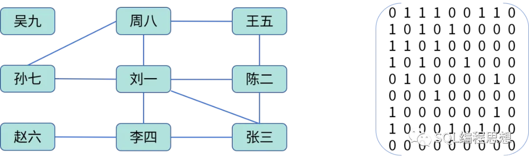 对于无向图,如果顶点 i 与顶点 j 之间有边那么 A[i][j] 和 A[j][i] 都为 1;上面的 A[1][2] 表示“刘一”和“陈二”是好友。
