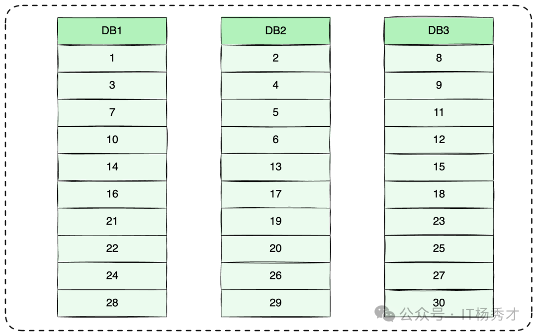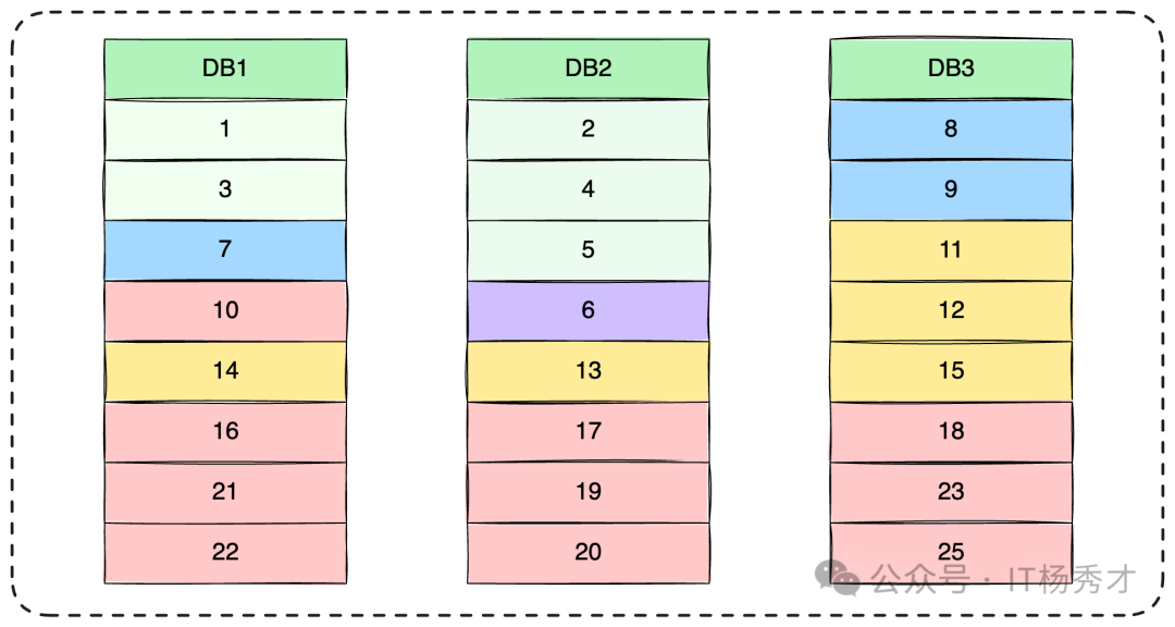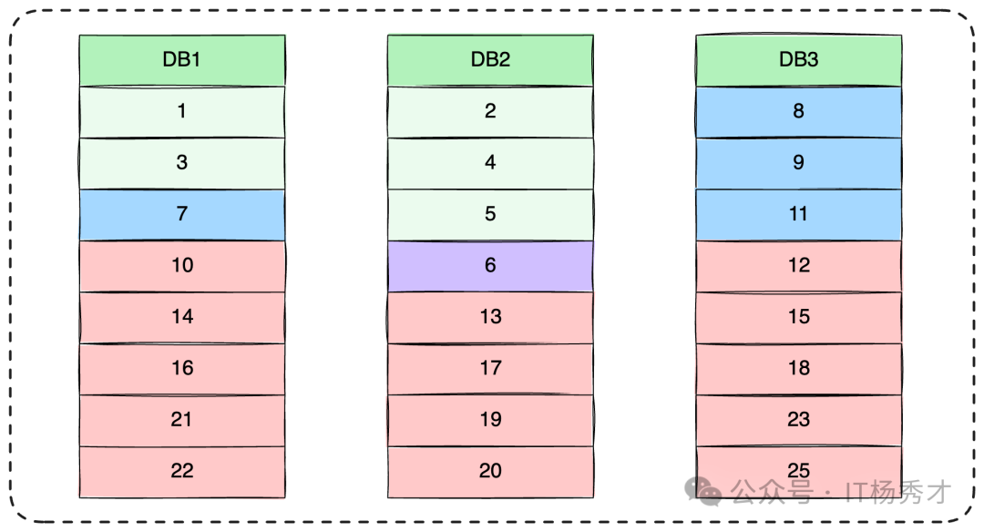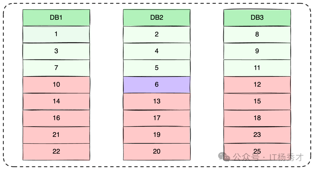 根据前面分析,在单一数据库中执行 LIMIT 5 OFFSET 10 查询时,返回的结果是[11-15]。那么,如果在这三个分库中进行全局查询 LIMIT 5 OFFSET 10,该如何操作呢?